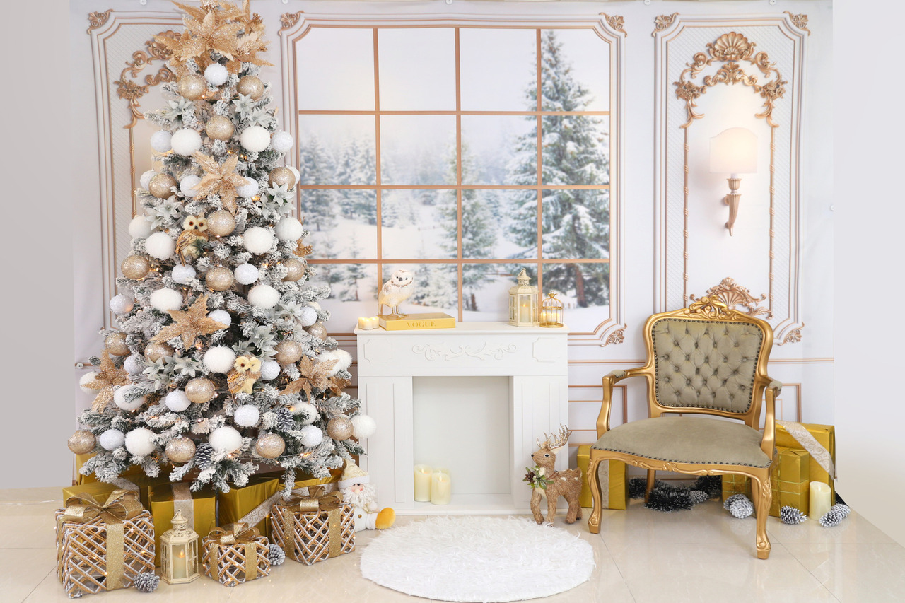 - Cenário 2 - Fundo parede Boiserie branca com janela natalina, Árvore nevada decorada 2,1m, Lareira Branca, Velas realistas eletrônicas, Poltrona Dourada, Presentes, Props infantis. Medida da Decoração (2,20m altura x 3m largura)